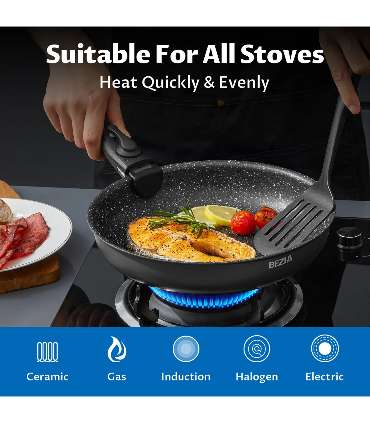 Plateau au four à la table :Plus d'options, de la cuisson à la cuisson en passant par le service, retirez toujours la poignée pour une utilisation au four, profitez de la polyvalence ultime de l'ensemble de casseroles et poêles à manche amovible Bezia.
